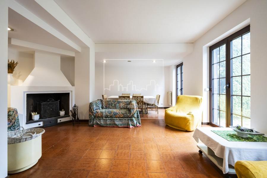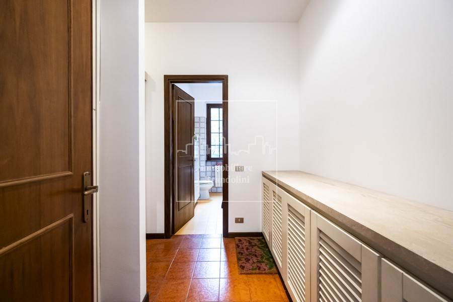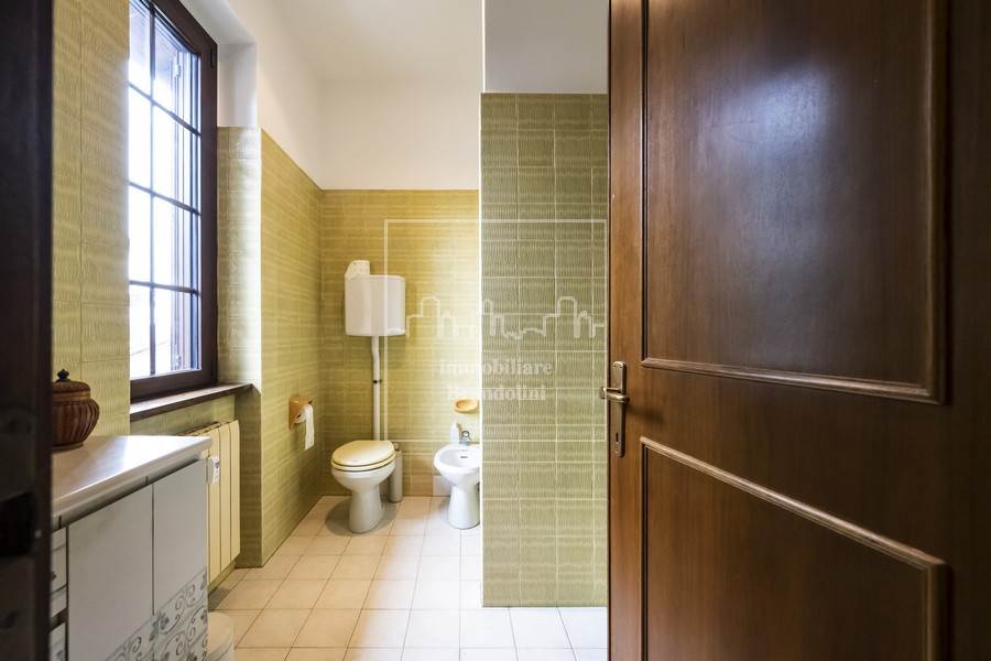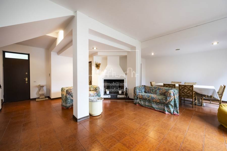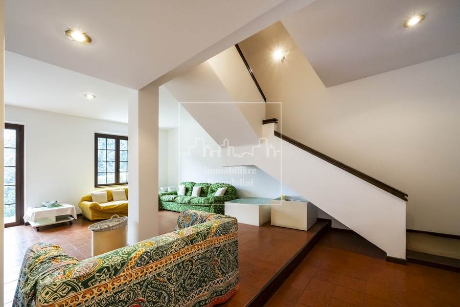 Al piano terreno grande soggiorno con sala pranzo e camino, cucina separata, bagno ospiti con lavanderia, ripostiglio, disimpegno con armadiature a muro.